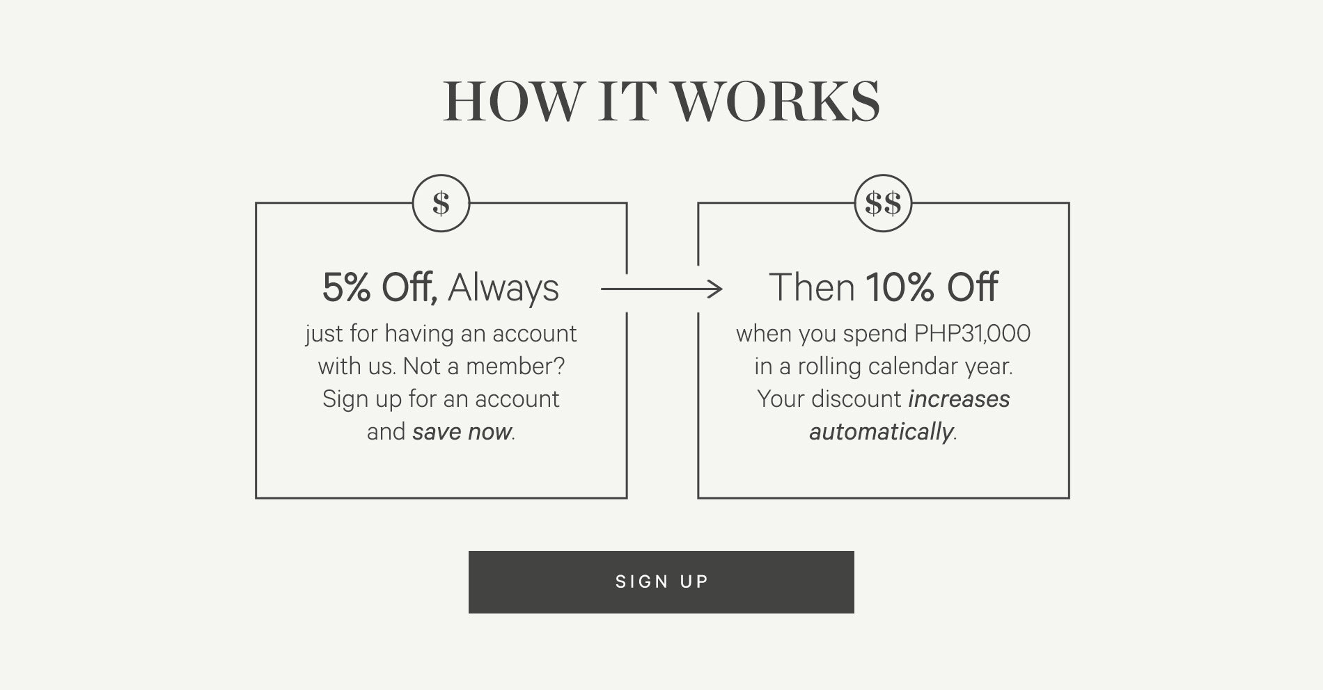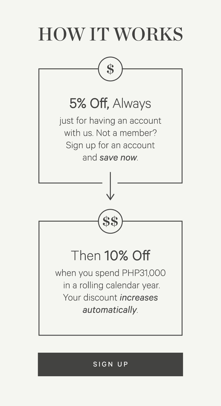 You’ll receive 5% off always when you’re logged into your account. Once you spend ₱31,000 within a rolling calendar year, your discount automatically increases to 10% off for the next calendar year. Your discount will be automatically applied at checkout, to make things easy for you.